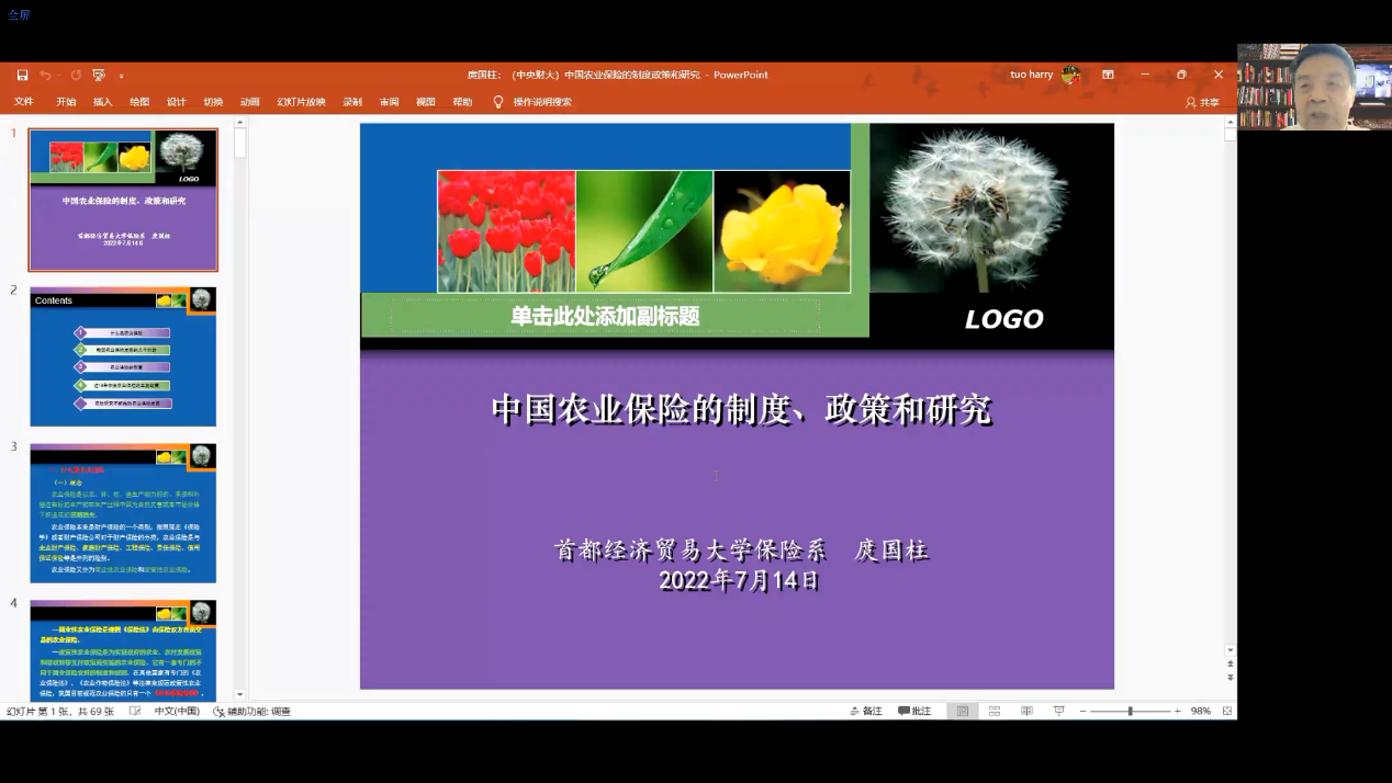 首都经济贸易大学劳动经济学院和财政金融学院教授、博士生导师,兼任中国社会保险学会理事,中国保险学会理事,北京经济学总会理事,北京保险学会和保险协会常务理事,北京国际金融学会常务理事的庹国柱教授做了题为《中国农业保险的制度、政策和研究》的报告。庹教授先对农业保险进行了详细的介绍,包括政策性和商业性农业保险两大类。他认为农业保险服务于农业和农村发展政策和财政转移支付政策,中国的农业保险制度发展经历了多个阶段,目前采用政府+市场的模式。而相关政策主要分为不同性质的农业保险相区别的政策、农业保险要统一管理的政策、财政政策、税收政策、市场组织政策、市场监管政策六类。