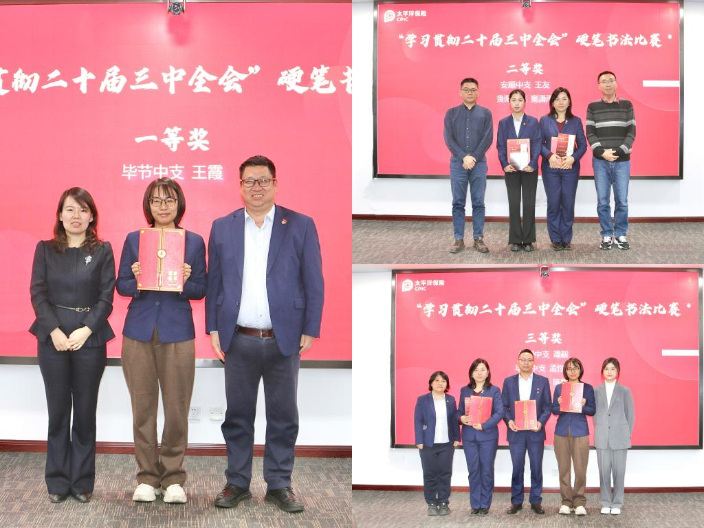 应太平洋产险贵州分公司邀请,王丽珍副院长一行为公司“学习贯彻党的二十届三中全会精神”硬笔书法比赛获奖的员工颁奖,并与公司互赠学习书籍。