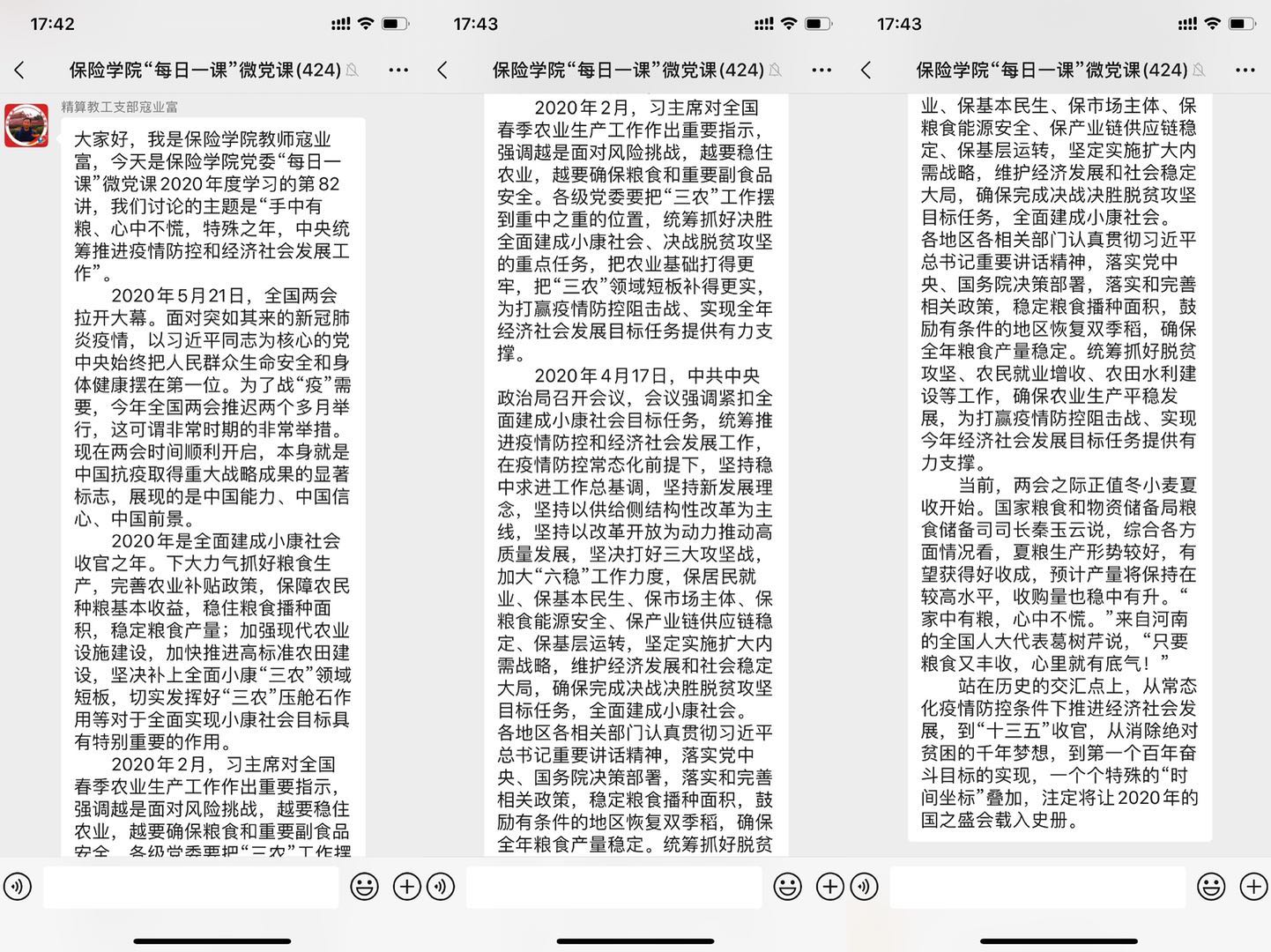 说两会,读报告。金沙js9线路中心师生党员利用“每日一课”微党课平台,分享两会内容,学习解读政府工作报告中的重点。精算教工党支部寇业富老师围绕政府工作报告中农业生产部分进行主题为“手中有粮、心中不慌,特殊之年,中央统筹推进疫情防控和经济社会发展工作”的宣讲,从政策补助、风险机遇、目标措施等方面解读政府工作报告中关于农业生产部分,他表示:“两会之际正值冬小麦夏收开始,站在历史的交汇点上,从常态化疫情防控条件下推进经济社会发展,到“十三五”收官,从消除绝对贫困的千年梦想,到第一个百年奋斗目标的实现,一个个特殊的“时间坐标”叠加,注定将让2020年的国之盛会载入史册。”