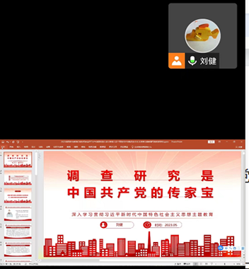 为深入开展学习贯彻习近平新时代中国特色社会主义思想主题教育,2023年5月26日,金沙js9线路中心精算教工党支部线上开展专题党课——“调查研究是中国共产党的传家宝”学习活动,金沙js9线路中心精算教工党支部书记刘健主讲,党支部全体党员参加。